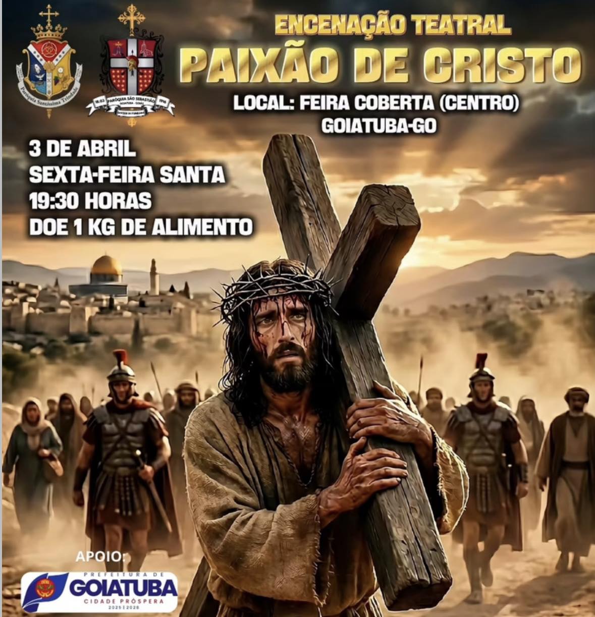 A comunidade católica de Goiatuba se prepara para uma noite de fé, emoção e reflexão com a tradicional encenação teatral da Paixão de Cristo. O evento, promovido pela Paróquia Santíssima Trindade, acontecerá no dia 03 de abril, às 19h30, na Feira Coberta (Centro).