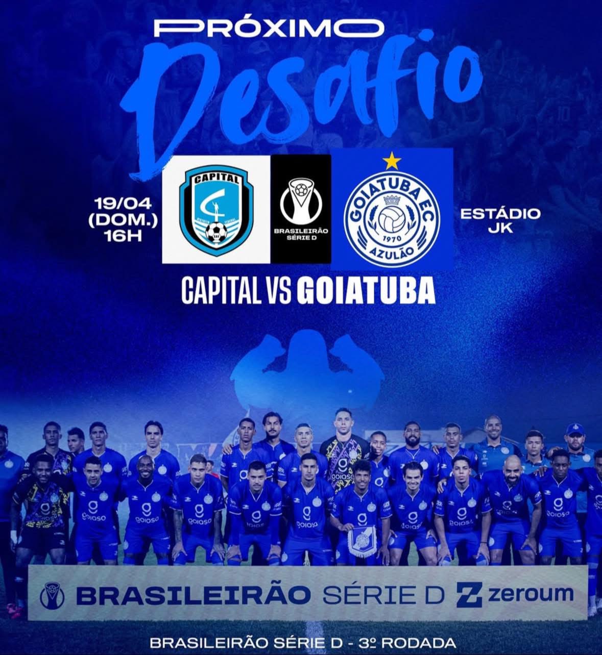 O Goiatuba Esporte Clube entra em campo neste domingo, 19 de abril, para mais um compromisso pela Campeonato Brasileiro Série D. A equipe goiana enfrenta o Capital Clube de Futebol, às 16h.
